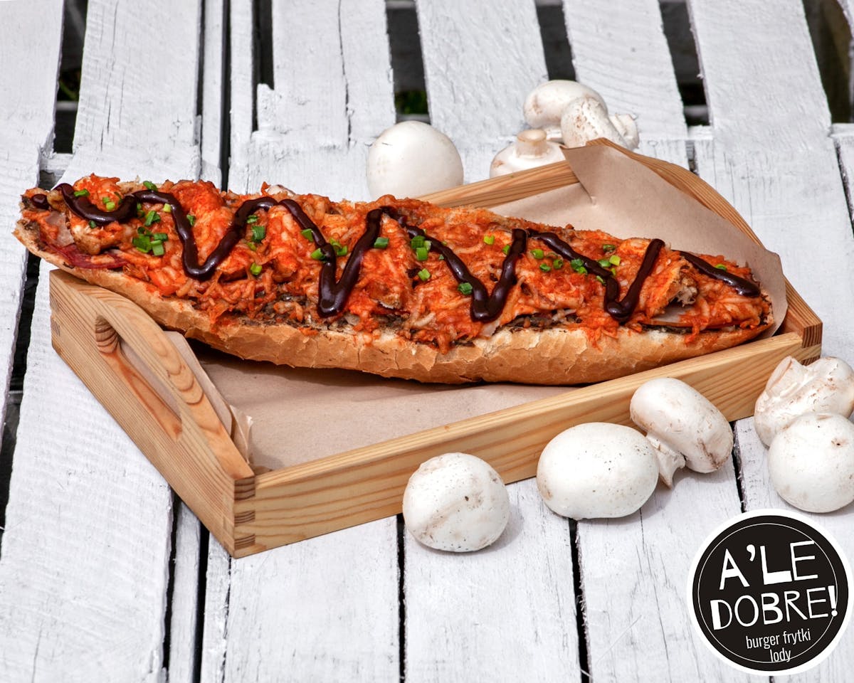 bagietka, farsz pieczarkowo – cebulowy, ser, sos.