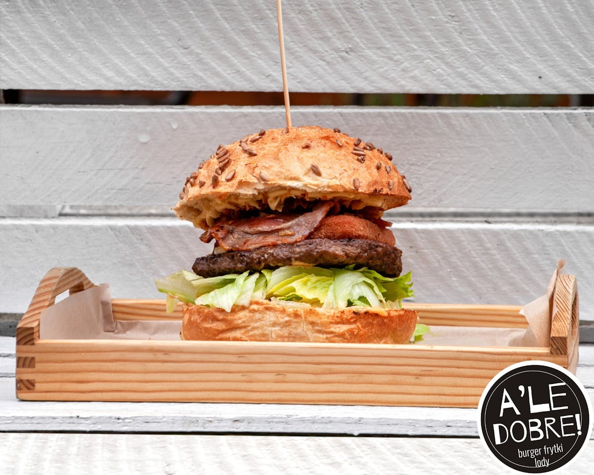 Pierwszy autorski burger z chrupiącym kurczakiem, sos mango-majo z delikatną nutą ostrości, sałata lodowa, rukola, pomidor, cebula, papryka pepperoni, mango.